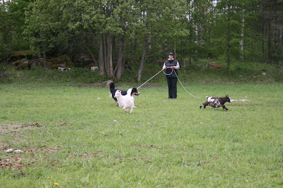 Eilen oli jännä päivä. Kahdeksan jälkeen aamulla Mari ja Wallu tulivat hakemaan minut ja Turren, koirat ilmiselvästi taas ihmettelivät, mitä nyt tapahtuu, minne mennään. Ajoimme Liperin risteyksen ohi (ai, ei mennäkään Susiahoon), Hannan risteykseen (ai, ei mennä Jatsinkaan luo), Wallun mummolan risteyksen ohi (ei siis sinnekään matka)...minne ihmeeseen ollaan menossa. Lopulta kaarroimme Kuttukuun lammastilan pihaan, jossa meitä tuli tervehtimään Vidi-bortsu ja...sika. Kyllä, meitä kohti jolkotteli ihan oikea sika tervehtimään...vähän mietitytti ensin, miten siihen pitäis suhtautua, mutta samalla tavalla rapsutusta vailla oli, kuin koiratkin :)Pitemmittä puheitta lähdimme töihin, otin Turren ensimmäisenä hommiin. Turre liinaan ja lampaiden kanssa pellolle. Aloitimme niin, että minä olin Turren kanssa perää pitämässä ja Sinikka sauvan kanssa edessä. Uskomattoman nopeasti Turre alkoi ohjata laumaa, kiertää kaarta ja pitää laumaa kasassa, muistaen ottaa myös laumasta erkautumaan pyrkivät mukaan. Hyvin kauniisti suhtautui eläimiin, ei räyhännyt, haukkunut, tai lähtenyt jahtaamaan. Melko pian vaihdoimme Sinikan kanssa osia, hän jäi Turren kanssa perää pitämään ja minä siirryin eteen, ja Turre alkoi ajaa laumaa minulle. Käännöksissä Turre kaartoi itse juuri oikeaan paikkaan, että sai lauman kääntymään. Oli se hienoa katsottavaa! Sinikka sanoikin ottavansa Turren itselleen lammaspaimeneksi, saan käydä syksyllä pois hakemasta :)